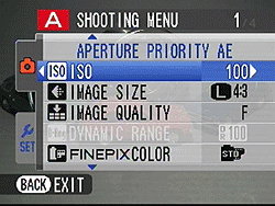 On the Fujifilm HS10's Shooting Menu's first page (there are four!) options include adjusting ISO, image size, image quality, dynamic range (DR value options are confusingly listed as 100%, 200%, and 400% with the higher number designed for scenes with more contrast), and FinepixColor (standard, Fuji Chrome which boosts color, B&W, and Sepia).