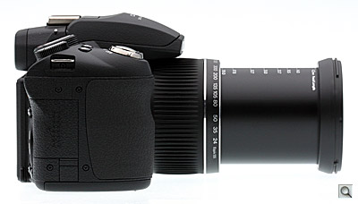 Though the Fujifilm HS10 is relatively compact, when you manually extend the lens all the way to 720mm, it telescopes out to about five inches from the body, or about seven inches total. One nice touch is that the lens provides actual and 35mm equivalent focal lengths on the lens barrel as you zoom. And while I like that its a manual twist-barrel lens -- rather than a slow electronic zoomer -- quickly adjusting the zoom takes some practice and I'd recommend looking through the 0.2-inch, 200,000-dot electronic viewfinder rather than in live view on the 3-inch LCD screen on back. Composing close-ups is a lot easier with the EVF and it won't wash out in bright sunlight. Another zoom hazard is that your thumb tends to run into the flash housing, so it's best to keep your fingers on the underside of the lens and zoom in steps rather than all at once.