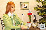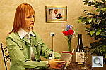 This shot duplicates indoor shooting conditions in most US homes, with fairly bright incandescent room lighting. The challenge here is for the camera's flash to blend naturally with the room lighting, and produce good, neutral color overall. - Some cameras will be overly affected by the room lighting, even with their flash enabled, and the result will be a strong orange cast. Another common failing is for the highlights from the flash to take on an unnatural bluish cast.