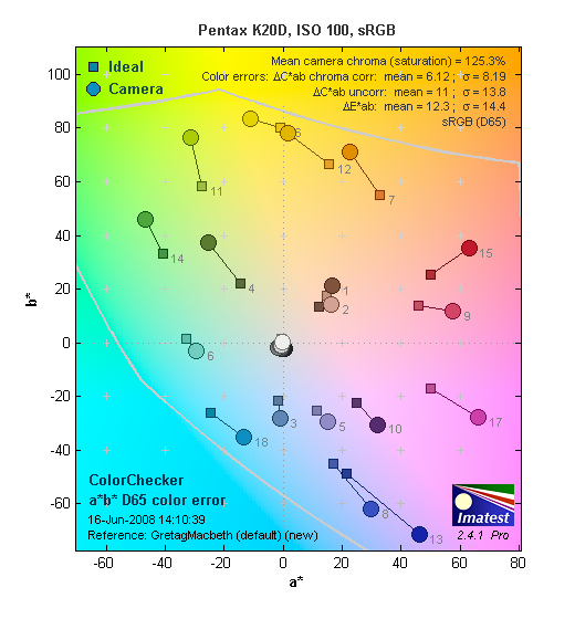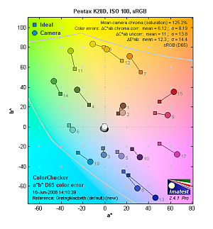Hue. The Pentax K20D showed a few color shifts relative to the correct mathematical translation of colors in its subjects, but had pretty good accuracy overall. Most noticeable was a shift in orange toward yellow, with some shifts in cyans and blues as well. Hue is "what color" the