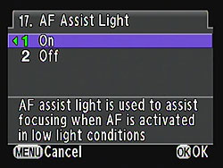 Although the AF assist lamp can be enabled or disabled through the Custom Function menu, enabling it doesn't guarantee that it will illuminate in all shooting conditions. Instead, it's left up to the camera to decide whether or not it needs help from the assist lamp to determine focus. In our experience, we found it only illuminated in relatively low light conditions.