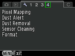 For taking a high contrast image to detect dust on the sensor. Camera should be aimed at a uniformly bright subject. Focus mode must be set to Single or Continuous Autofocus, and Mode dial to any mode other than Movie. |