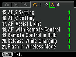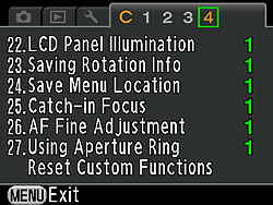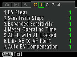 Default value illuminates LCD panel at maximum brightness when exposure metering. Option 2 uses a lower brightness. Option 3 disables illumination altogether. |