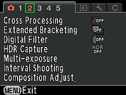 Enables or disables an effect intended to be reminiscent of cross-processing, a technique from film photography. As well as three presets, the effect can also be randomized. In addition, you can save the settings used for a previous image as a Favorite for later reuse. This defaults to taking the settings from the most recently captured image, however you can also copy the settings from any other cross processed image on the flash card, including those which have been cropped, resized, or had filters applied. Not available unless shooting in JPEG-only mode. Precludes use of multi-exposure, extended bracketing, HDR capture, white balance, or custom image functions. |