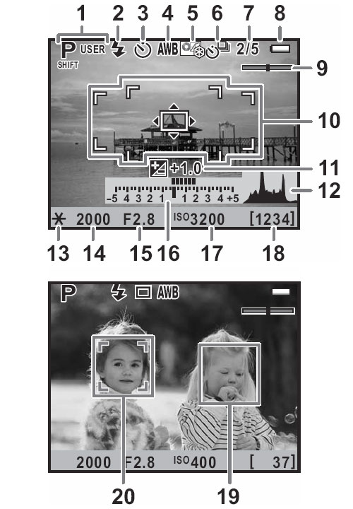 The illustration below (courtesy of Pentax) shows what info is available on the Pentax K-7 in Live View mode.