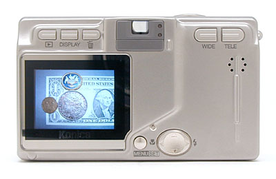 Equipped with a telescoping, 3x, 8-24mm Hexanon lens (39-117mm 35mm equivalent), the KD-400Z's tiny size doesn't compromise its optics. Focus remains under automatic control, and ranges from 1.6 feet (0.5 meters) to infinity in normal mode, and from 3.9 inches (10 centimeters) to infinity in Macro mode. Apertures range from f/2.8 to f/8.2, with actual values depending on the lens' zoom setting. A blue AF illuminator lamp on the front of the camera shines a dim light on the subject in low-light situations. In addition to the camera's 3x optical zoom, as much as 2x digital zoom is also available, effectively increasing the KD-400Z's zoom capability to 6x. (I always remind readers that digital zoom typically decreases overall image quality because it simply enlarges the center pixels of the CCD image. Resulting images often have softer details and higher noise levels.) Both a real-image optical viewfinder and 1.5-inch color LCD monitor are available for composing images. The LCD monitor features an information display that reports limited camera settings information (though not the shutter speed or aperture settings).