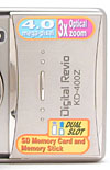 As the first digicam not made by Sony to accept the Sony Memory Stick, Konica's Digital Revio KD-400Z marks a revolution in digicam thinking. The dual-slot digicam also accepts the tiny SD memory cards, making the camera more compatible with PDAs and other high-tech personal devices. In the age of Palm Pilots and multi-function, whiz-bang cell phones, the KD-400Z's flexibility is a valuable asset. Adding to the KD-400Z's attractions are its tiny size and stainless steel alloy body. Compact and rugged, the KD-400Z should stand up to heavy usage. The sliding lens cover design eliminates the need for a lens cap, enhancing the camera's charms for travelers. Small enough for a shirt pocket, the KD-400Z has a wrist strap for easy toting. The 3x zoom lens and 4.0-megapixel CCD capture high resolution, print quality images, with great color and detail. With high-tech simplicity and ease-of-use forefront in the KD-400Z's design, the camera's point-and-shoot operation is quick to learn and convenient.