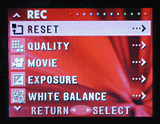 Exposure remains under automatic control on the KD-400Z, though a few manual controls such as White Balance and Exposure Compensation are available. Fewer physical controls keep the user interface simple, but also mean heavier reliance on the LCD menu system. That said, the KD-400Z's LCD menu is straightforward and uncomplicated, with a scrolling page layout. The sliding lens cover serves as the power switch, triggering the lens to extend forward when opened. Macro, Self-Timer, and Distant View (landscape) photography modes are accessed via the left arrow of the Four-Way Arrow pad. By default, the KD-400Z employs a TTL center-weighted metering system, but a Spot metering option is available through the Record menu. An Exposure Compensation adjustment lightens or darkens the overall image from -1.5 to +1.5 exposure equivalents (EV) in one-third-step increments. (Note that the adjustment bar doesn't have any numeric indicators, just a series of bars to indicate EV steps.) Shutter speeds range from 1/2,000 to 1/8 second in normal shooting mode, but a Slow Shutter mode extends the range to one full second. The camera's White Balance adjustment offers Auto, Daylight, Cloudy, Fluorescent, and Tungsten options, for shooting under different light sources. You can also opt to record images in Sepia tones. The KD-400Z's built-in flash operates in Auto, Forced, Red-Eye Reduction, Suppressed, and Slow-Sync modes.