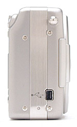 On the right side of the camera is an eyelet for attaching the wrist strap, as well as the USB jack.