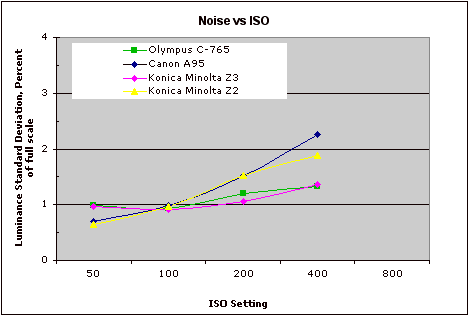 This chart compares the Konica Minolta DiMAGE Z3's noise performance over a
