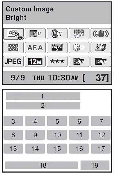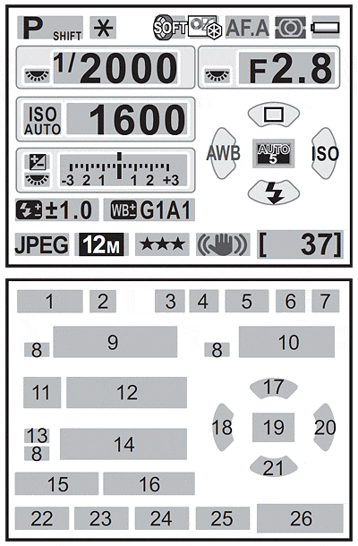 Compared to that from the K-x, the K-r's Control Panel display is almost unchanged. The only slight change is that the date and time display is now shown with a different font, and includes the day of the week before the date (not after it, as shown in the illustration).