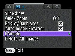 Pressing the Down arrow button in Playback mode while viewing a full image with or without basic overlay will call up the Playback Mode Palette. Here, you can develop Raw files in-camera, perform a variety of image manipulations, create slideshows, print orders and index prints, compare images, edit movies, and store the white balance from a particular image as a preset.