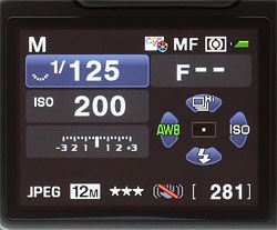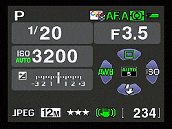 Control Panel Display When the Info button is pressed, the Status screen changes to a Control Panel display, allowing direct access to both commonly adjusted settings and some less commonly adjusted settings without the use of the menu system. The e-dial can be used to make direct adjustments to settings without entering a menu, or the OK button pressed to view all available options for a particular setting. The Control Panel display with disappear automatically after 30 seconds of non-use, reverting back to the Status display above (if enabled), or a blank screen. Like the Status display, the Control Panel display will automatically flip between landscape and portrait mode displays to match the orientation of the camera.