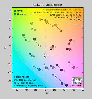 Saturation. Like all recent Pentax DSLRs, the K-x's default settings push most colors by quite a bit, especially blues, greens, and some reds. Overall, images were very bright and punchy, with color that was a little over the top for an SLR, though the K-x's target market would likely prefer that to more accurate saturation. You can, however, always select a different Image Tone setting or tweak saturation and contrast to suit your own tastes. Most consumer digital cameras produce color that's more highly saturated (more intense) than found in the original subjects. This is simply because most people like their color a bit brighter than life.