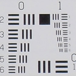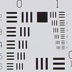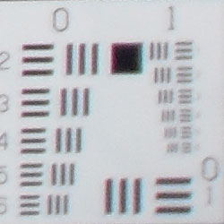 Chromatic aberration is moderately high at wide angle, showing about 6-9 pixels of coloration on either side of the target lines, though the effect isn't terribly bright or distracting. At telephoto, distortion is much lower, with practically none visible in the top left corner. This distortion is visible as a slight colored fringe around the objects at the edges of the field of view on the resolution target.