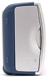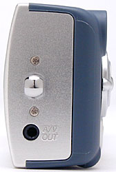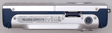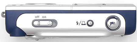 The LS420's front panel is fairly smooth, with no real protrusions to catch on pockets. Across the front are the flash, self-timer LED, light sensor, lens, optical viewfinder window, and microphone. A sliding metal lens cover slips out of the way whenever the camera is powered on, eliminating the need for a lens cap. The fixed-focal-length lens doesn't extend when the camera is powered on, maintaining the smooth profile.