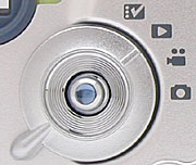 The few remaining camera controls are on the back panel, along with the LCD monitor and optical viewfinder eyepiece. An LED lamp next to the viewfinder eyepiece reports camera status, indicating when the flash is charging, or exposure is set. (The LED lamp flashes green while an image is being saved to memory, yellow while the flash is recharging, or red to indicate a problem with exposure.) A large Mode dial selects the camera's operating mode, with a large tab that makes turning it easy. Instead of the four way arrow pad or rocker toggle found on many cameras, the LS420 features a unique joystick control in the center of the Mode dial, which navigates through menu settings and controls digital zoom. I really liked the feel of this control, as it was very natural and intuitive when adjusting settings, and seemed to be much more sure-acting than the rocker toggle controllers used on some cameras.