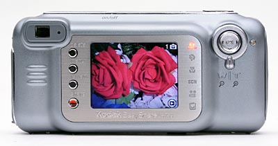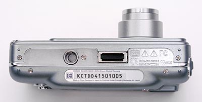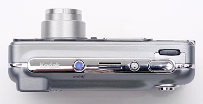 The telescoping lens is the dominant feature on the LS753's front panel, almost perfectly flush with the front of the camera, letting the camera slide smoothly in and out of pockets. The lens extends outward just under an inch further when the camera is powered on. A shutter-like cover protects the lens, automatically sliding open when the camera is activated and closing again when the camera is turned off. There's thus no need for an easily-lost lens cap. Also on the front panel are the optical viewfinder window, flash, Self Timer / Video light, light sensor, and a tiny microphone. A slight depression between the lens panel and neck strap attachment, in the area of the diamond-cut Kodak logo, provides a subtle finger grip.