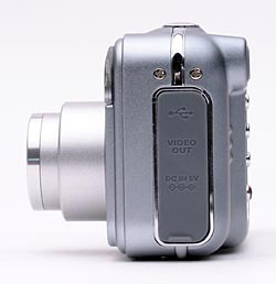 The opposite side of the camera features the connector compartment, covered by a flexible rubber flap. Inside the compartment are the DC In, Video Out, and USB connector terminals.