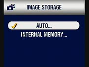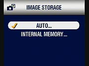 - Image Storage: Dictates where images are stored, either in the 32MB internal memory or SD card. Auto tells the camera to store images on the SD memory card if one is inserted and has space available, while "Internal" restricts storage to the internal memory only. (secondary screen)