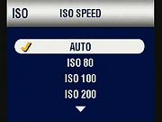 - ISO Speed: (Not in Scene or Movie modes.) Sets the camera's sensitivity to Auto, 80, 100, 200, 400, or 800 equivalents. Setting the ISO to 800 automatically limits the resolution to Good (1,492 x 1,112 pixels). (secondary screens)