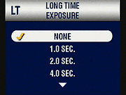 - Long Time Exposure: (Still capture modes only.) Accesses longer exposure times, for darker shooting conditions. Shutter speeds choices are 1, 2, 4, 8 or 16 seconds, and are set manually. (Don't worry if you don't know what exposure time to use - Just shoot a test picture and see how it looks, adjust as needed, and discard any photos that don't turn out. - Isn't digital great?) (secondary screens)