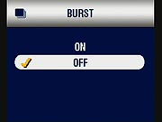 - Burst: (Not in Scene or Movie modes.) Enables or disables the burst mode, which captures up to four images at a speed of 2.4 frames per second while the shutter button is held down. Flash, Self-Timer and Long Time Exposure are disabled when Burst mode is set. (secondary screen)