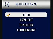 - White Balance: (Not in Scene or Movie modes.) Sets the white balance to Auto, Daylight, Tungsten, or Fluorescent modes. (secondary screen)