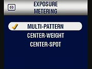 - Exposure Metering: (Not in Scene or Movie modes.) Default setting is Multi-Patterned, but Center-Weighted and Center Spot options are available. (secondary screen)