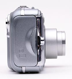 The right side of the camera (as viewed from the rear) holds the battery / SD memory card compartment, and the eyelet for attaching the wrist strap. A hinged, plastic door protects the battery / memory compartment.