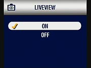- Liveview: Enables or disables the LCD's "live" view, meaning that it turns on or off the LCD viewfinder. The same thing can be accomplished by pressing the center of the four-way controller. (secondary screen)