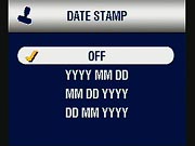 - Date Stamp: Imprints the date on images. Options are Off (the default), "YYYY MM DD", "MM DD YYYY", or "DD MM YYYY", where DD is the two-digit day, MM is the two-digit month, and YYYY is the four-digit year. (secondary screen)