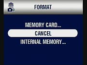 - Format: Formats the SD memory card or internal memory. Provides an option to cancel, instead of selecting either option. (secondary screen)