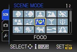 Baby1 and Baby2 could use a little explanation. They are two of the same thing (for two different babies), which sets the flash weaker than normal, and uses Macro mode and Intelligent ISO. But you can set different birthdays and names for each setting and these can be displayed during Playback or stamped on the recorded image using the Text Stamp feature.
