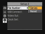 File Number: Sets file numbering to Series or Reset. The Series option continues numbering files from one memory card to the next, while Reset starts over with each new memory card.