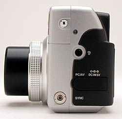 The opposite side of the camera houses the external flash sync terminal, an