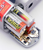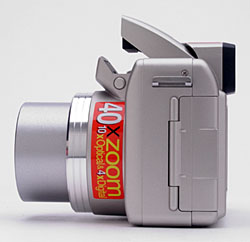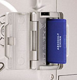 Images are recorded to SD memory cards, and a 16MB card comes with the camera (although strongly I advise picking up a larger card so that you aren't limited by a small image capacity). Four AA batteries power the camera (either NiMH or lithium is recommended), and a set of single-use alkaline batteries is included. I advise picking up two sets of rechargeable NiMH batteries and a good charger, so that you have a freshly-charged set on-hand at all times. Click here to read my "battery shootout" page to see which batteries currently on the market are best, or here for my review of the Maha C-204F charger, my longtime favorite. Also included with the camera is an A/V cable for connecting to a television set, and a USB cable for downloading images to either a Mac or PC. The accompanying Digital Still Camera software CD includes ACDSee for minor image editing and organization capabilities.
