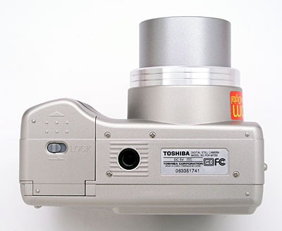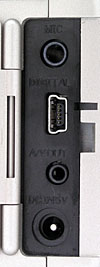 The camera's bottom panel is nice and flat, holding the plastic threaded tripod mount and battery compartment. The battery compartment is too close to the tripod mount to allow for quick battery changes when working with a tripod, but the side DC In port allows convenient connection to the AC adapter when working indoors. The battery compartment door slides forward before opening, and features a latch to prevent it from accidentally opening while shooting.