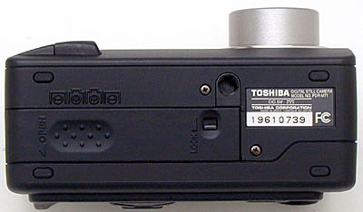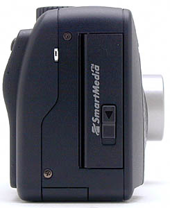 The right side of the camera (when looking at the back panel) houses the SmartMedia compartment and wrist strap attachment eyelet. A sliding switch releases the compartment door, revealing the memory card slot.