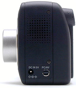 On the opposite side of the camera are the input jacks (DC In and PC/AV) and a built-in speaker.