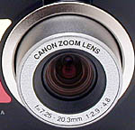 A Canon 2.8x, 7.25-20.3mm zoom lens is built into the PDR-M71, the equivalent of a 35-98mm lens on a 35mm camera. Aperture can be manually or automatically adjusted from f/2.9 to f/8. The PDR-M71 employs a contrast-detection autofocus mechanism, with a focal range from 2.7 feet (80cm) to infinity in normal mode, and from 4 inches (10cm) to infinity in Macro mode. A Focus button on the back panel accesses the Macro mode, as well as three fixed-focus settings (1 meter, 3 meters, and Infinity). Though the PDR-M71 does not feature a focus lock button, you can manually lock focus by pointing the center of the frame at a specific part of the subject and depressing the Shutter button halfway, then reframing the subject while keeping the Shutter button halfway depressed. This locks focus and exposure until the Shutter button is either fully depressed or released.