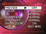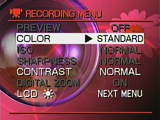 Manual mode also offers an on-screen Recording menu with additional exposure options: Color, ISO, Sharpness, and Contrast. The Color control includes Standard, Vivid, Monochrome, and Sepia settings. ISO, or light sensitivity, is adjustable in 100, 200, and 400 ISO equivalents (options are presented as Normal, 2x, and 4x). Sharpness can be set to Normal, Soft, or Hard. Contrast options include Normal, Strong, and Soft.