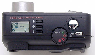 Neatly housed in an jet-black all-plastic body, the 3.2-megapixel PDR-M71 is a companion model to the 4.2-megapixel PDR-M81 introduced in July (2001). It has most of the features we enjoyed in the previous PDR-M70, but with some expanded user controls, including a full manual exposure mode. Absent from this latest design though, is any provision for an external flash unit. The PDR-M71 is compact, measuring 4.2 x 2.8 x 1.8 inches (107 x 71 x 47mm), and should fit easily into a large coat pocket or purse. It's also lightweight, approximately 12 ounces (340 grams) with the batteries and media card installed, and comes with a small carrying case and wrist strap.