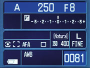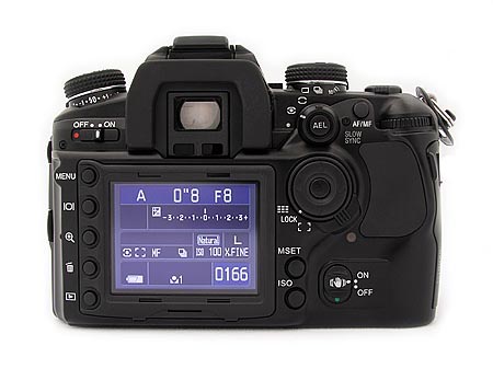 Of course, that doesn't mean this is an all-manually-controlled camera. Not at all. For in addition to all these switches and buttons is a massive menu system and all the customary dials and buttons that drive the camera. Thankfully, the saving grace is Konica Minolta Maxxum 7D's 2.5 inch display, which makes the menu text big and clear. This big screen also doubles as the camera's status display. When used as a status display, it even rotates as you rotate the camera, either left or right. (No, it doesn't go upside down, though of course we had to try.) Just as Olympus chose to do on their EVOLT, most users will want to--indeed need to--leave the status display on all the time to see the vital metering and setting information, even with the preponderance of dials and switches. They even placed two IR sensors under the optical viewfinder to turn off the screen when you put the camera to your eye to keep glare from affecting your view. Of course, once you've captured a picture, it displays here in beautiful color and you can zoom in or out.