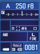 Controls are man-sized, buttons are big enough to know for certain that you're pressing that very button and not some button nearby, and it is clearly indicated which icon is currently selected by a given switch or dial. The two largest dials are more like control towers, with a dial accessed and read from the top, and another switched from underneath. My favorite is the Exposure compensation control on the left of the top deck. You can choose to adjust your exposure compensation by 1/2 increments or 1/3 increments depending on which side you switch it to. Beneath this is the Flash Exposure Compensation dial, whose scale is viewed from the back, while the lever that turns it juts out from the front of the dial. A similar arrangement drives the Mode dial. For once there's little naming confusion for the Mode dial: both major Mode categories are controlled here. You control the Exposure Mode (Program, Aperture, Shutter, etc.) with the top dial, and change the Drive Mode (Continuous, Bracketing, Single, Self-Timer) with the bottom dial. We particularly liked the AF/MF button on the back of the camera, which allows you to either momentarily trigger the AF system, or to toggle between Manual and Auto Focus modes, just in case you decide you want to refine what the AF system has done on the fly. Excellent. Easy. No attention required for the LCD, so your brain can begin to assign one set of controls visually to that part of the camera. Your mental map doesn't need to include a slew of menus and button combinations just to change a basic setting, it can become second nature--the kind of thing your finger muscles can learn to do without conscious thought.