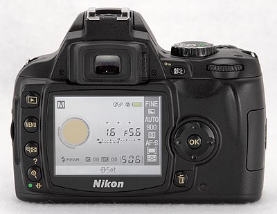Most of the camera's remaining controls are found on the rear panel. As we noted earlier, there are fewer buttons present than on any other Nikon DSLR, making for a bit simpler user interface, but one that won't be quite as fast for advanced users to navigate as that on the D50 or D80. We'll start our tour at the top left, and proceed counter-clockwise from there.