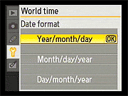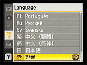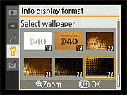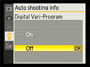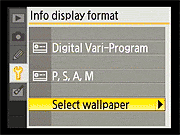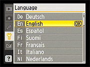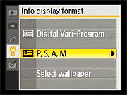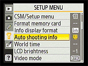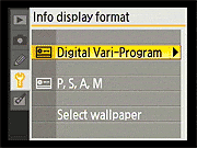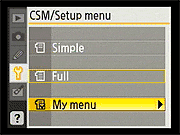 Here again, the D40's Setup menu is pretty conventional. Of note are the ability to configure a custom "My Menu" that will show only the options you use most (good for making a simplified menu configuration for novice members of a family to use), and the options for selecting the style for the main Shooting Display. Also notable is that different Shooting Display formats can be used for the Vari-Program (Scene) modes and the more advanced PASM modes. |
