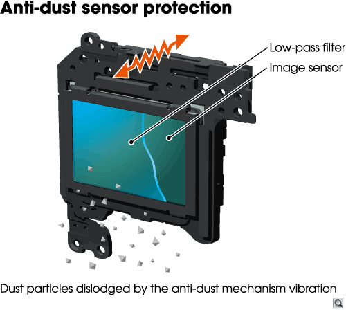 The Sony NEX-5 features an electromagnetic vibration dust-reduction system, coupled with a charge protection coating on its low-pass filter that aims to prevent dust adhering -- especially important since the NEX-5's shutter is normally open for full-time Live View. The vibration seems to be at a rather lower frequency than some competing systems (or perhaps to have a harmonic at a lower frequency), because it's clearly audible as a brief, high-pitched whine when operating. Intelligently, the system automatically runs only at power-off, meaning that it doesn't delay camera startup. It can also be triggered at any time while using the camera, should you notice that dust specks are present in your images.