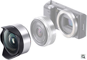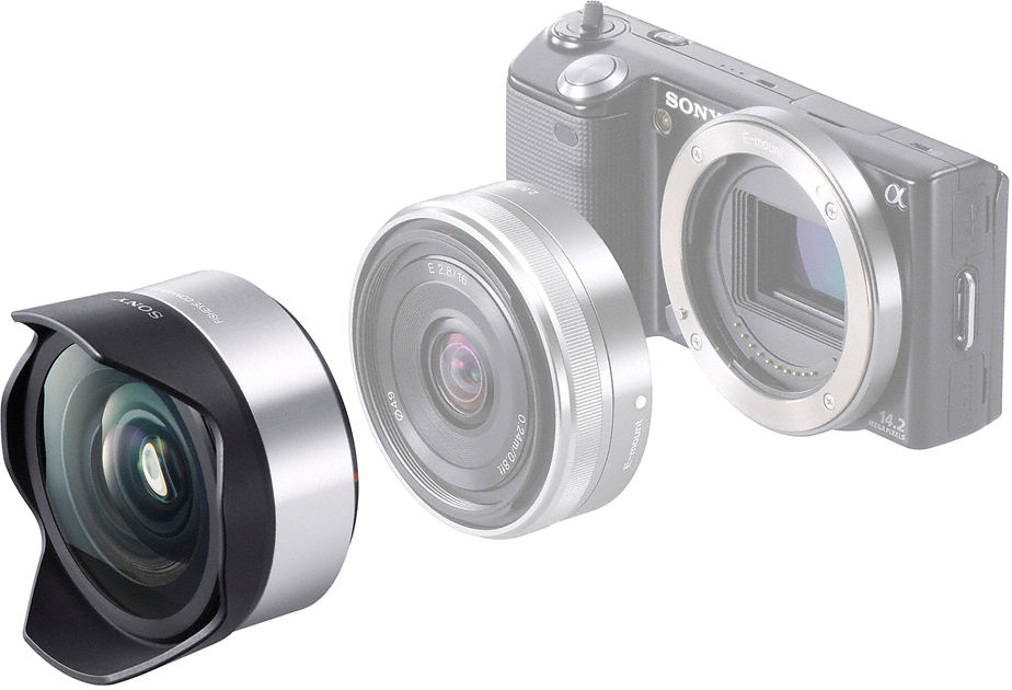 Conversion lenses. Sony offers two conversion lenses for the NEX-5. Mounted on the 16mm (24mm equivalent) prime, the 0.75x ultra wider converter provides an 18mm-equivalent focal length. The 0.62x fisheye converter (pictured) accommodates even more of your subject, with a 15mm-equivalent focal length.