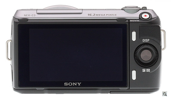 A very tacky rubber forms the thumbgrip on the back. It's a little far to the right for me, but it's designed to keep the thumb off the top soft key, which usually acts as the Menu button. The sparse control cluster is made even more sparse with the omission of the left and right Drive and Flash mode icons, necessary because of the slight slimming of the NEX-C3 left to right. However, these two positions are customizable now, offering more interface flexibility, as is the lower soft button just right of the LCD and the button in the center of the wheel.